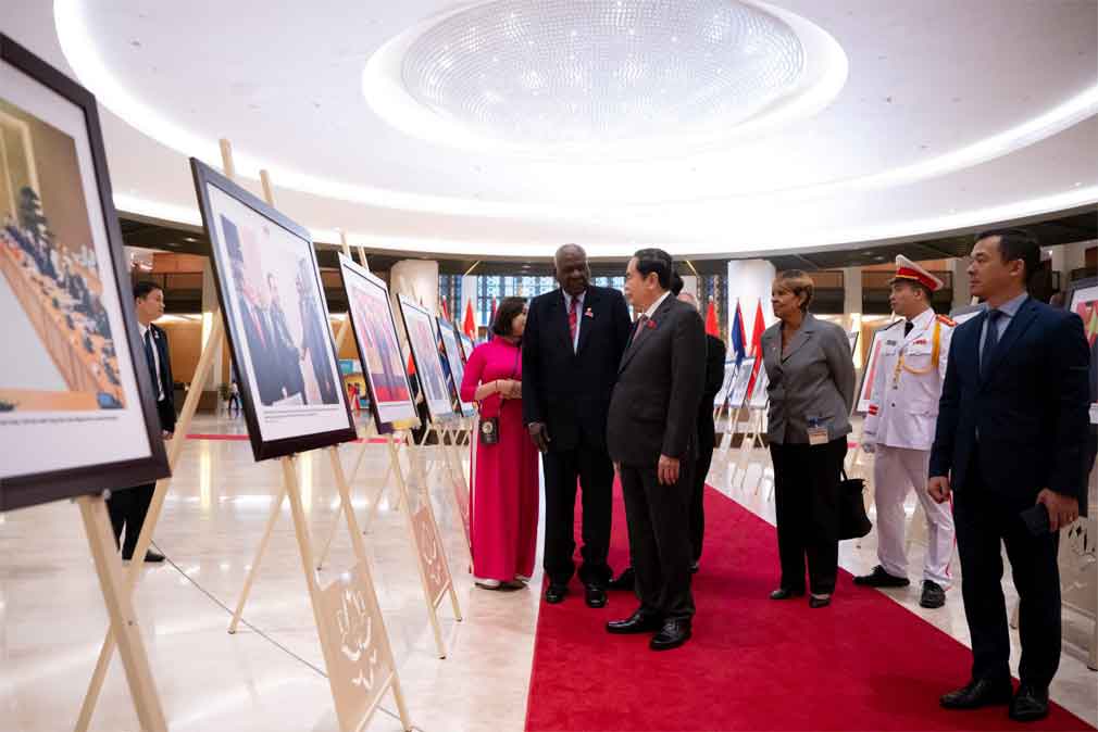 Thanh Man aguardó en la entrada del recinto del Legislativo por el también titular del Consejo de Estado de la República de Cuba, junto al cual recorrió luego una exposición fotográfica instalada en el lobby central del propio inmueble y que recoge hitos de los 65 años de relación especial existente entre ambos países.
